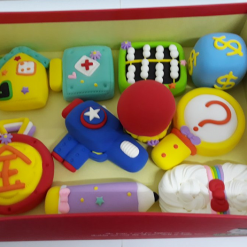 Hộp 10 món cho bé trai: Ngôi nhà, micro, máy bay, trạng nguyên bút, súng lục, camera, con chuột, hòm thuốc, bộ đạo diễn, cái chùy quan toàn.